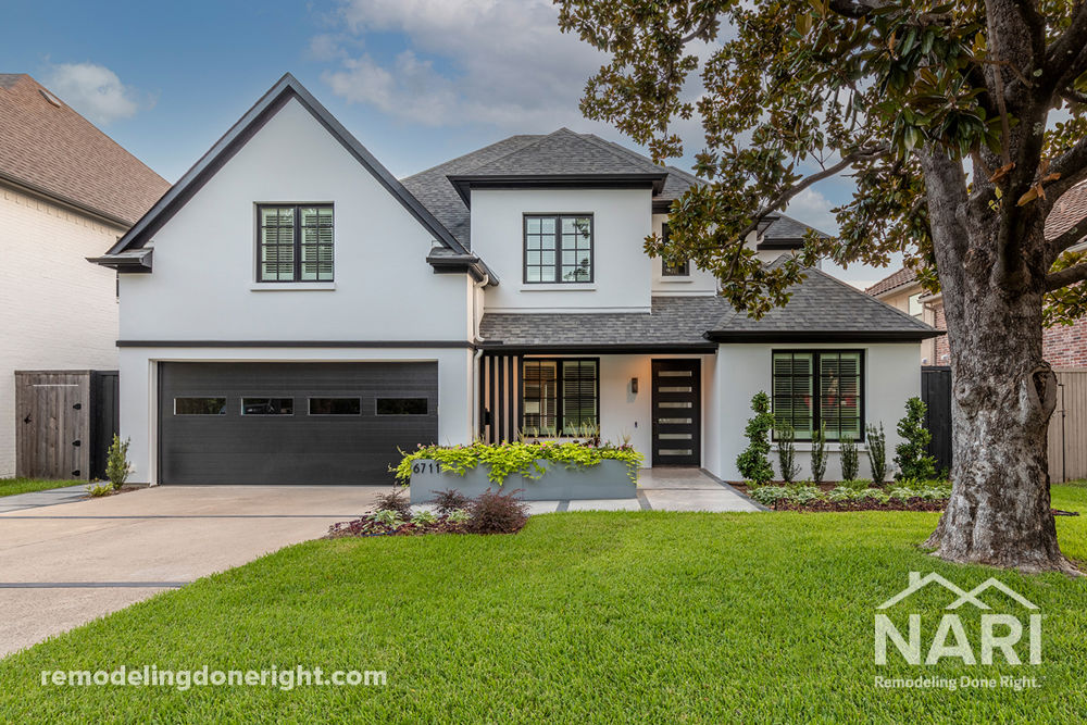 The client wanted to lighten up the exterior of their home to match the already updated interior. They desired a fresh and modern aesthetic and decided on a smooth white stucco exterior and black trim. They also wanted a more spacious and functional front patio. A large planter box and new landscaping was added in the front yard and backyard. Their back patio was updated with a black granite hearth and surround to match the rest of the house. The final touch was adding a putting green, making the backyard a haven for the entire family.
