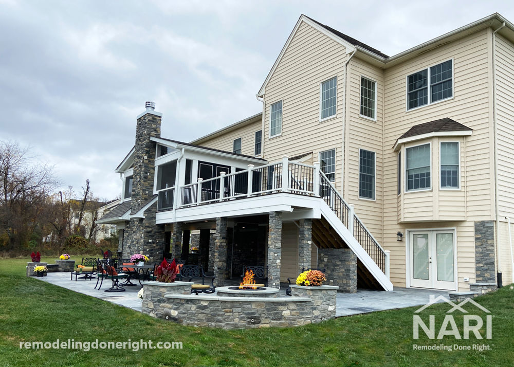 Given their love of the outdoors, this family wanted to be able to walk out of their kitchen door and into a three-season screened space with an attached deck, which led to a ground level patio and outdoor kitchen. As part of the newly established two-tier outdoor living space, the ground level was covered with black flagstone and coordinated veneer stones on wall columns and a house wall. To make every entertaining occasion comfortable, a seating wall with a round fire pit was installed with enough seats to fit every guest.
