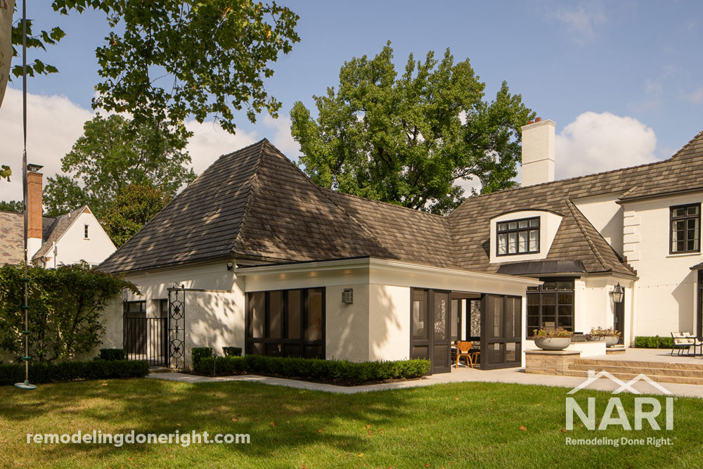 To get the most out of their backyard space, this family of 4 desired a screened porch for relaxing, entertaining, and enjoying views of their patio and pool. The screened addition compliments the home's French-style architecture featuring full-height screens with sliding doors, and a beam-and-shiplap ceiling. A functional outdoor kitchen complete with a beverage bar, mini-fridges, seating, and separate dining space, makes this the perfect backyard oasis.