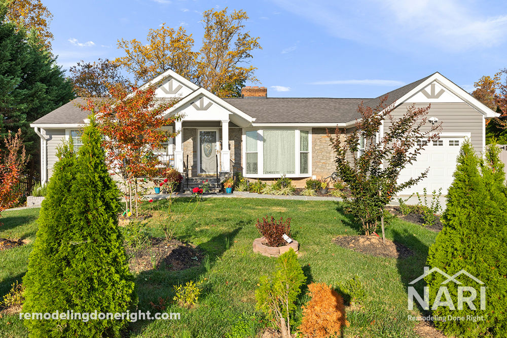The homeowner purchased this 1970 rambler and wanted to uplift the exterior of this property and bring its maximum potential. The design incorporated an arts and crafts style. A new 6'x30' stone front porch with stone and tapered columns, excavation of the front to allow a new flagstone walkway, and a wide staircase entering the home were added. The front elevation was revamped with new siding and water table stone, and a new bay window was added floor to ceiling.