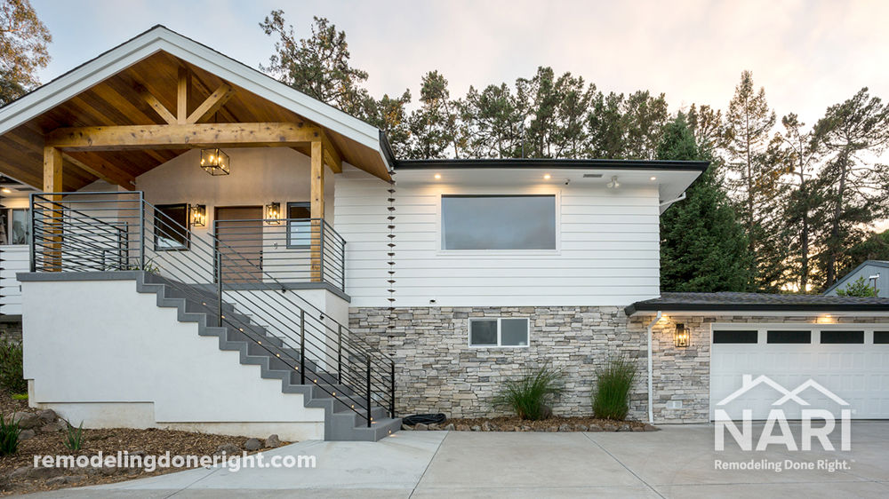 The homeowners dreamed of transforming their disjointed double-door entry into a warm, elegant statement atop their vast driveway. Meticulous waterproofing enabled expansion below the stairs. Artistry abounded, from illuminated steps to hand-cut tile stone cladding, contrasting with stucco for an old-world allure. A restful sitting area under sleek railings displaying intricate metalwork. Matching the cedar gable with modern materials unified indoors out. Understanding the home's spirit, the owners' vision was to merge past character with contemporary grace. The result is an inviting entry seamlessly tying the driveway to the home, a space not just to enter but to belong.