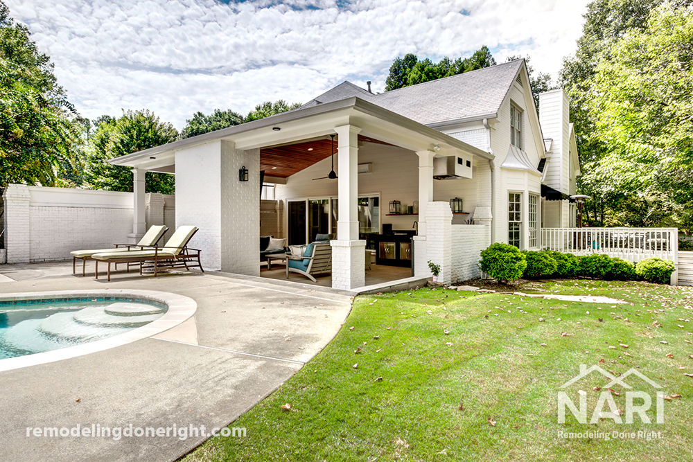 The exterior of this home was enhanced by designing and building an outdoor kitchen. This new outdoor space with a full kitchen, relaxing sitting areas, a fireplace and television, an HVAC unit, and a 16-foot sliding door creates a great gathering area for visitors and family. The new facade includes a ship-lap accent wall, and awkward brick steps were replaced by slip-resistant flooring. Additionally, the outdoor fireplace, a new tongue groove ceiling with contrasting roof beams, and strategically placed ceiling fans create the perfect poolside experience. Talk about giving a new meaning to cooking at home!