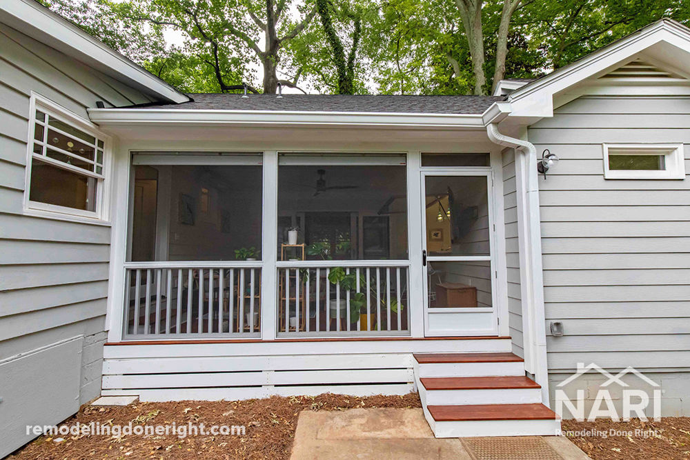 Frustrated with their awkward deck, these homeowners wanted an open porch that was comfortable and easy to keep clean all four seasons. After removing the breezeway and bay window, a continuous roof covers the new screened porch, complete with a 12-foot-wide sliding glass door that connects to their home's interior. A large, top-hinged window opens to create a pass-through porch bar with infrared heaters and a ceiling fan, making the renovated porch the perfect place to enjoy any time of the year.