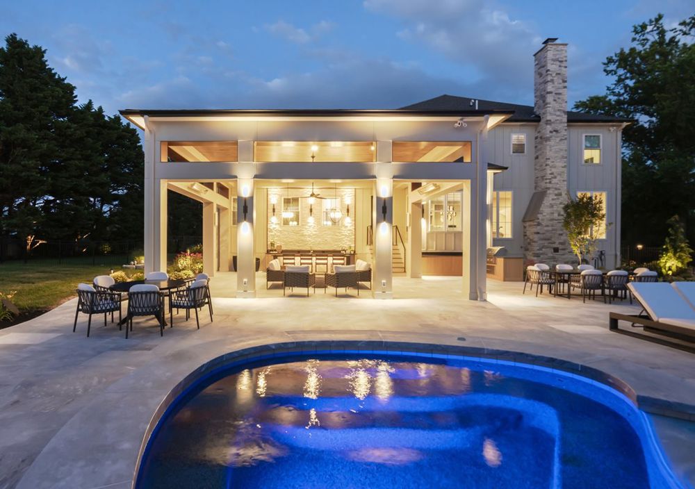 The clients sought a full exterior renovation with a covered cabana for their pool. The exterior was updated with Hardie Board siding. The front elevation was accented with a metal standing-seam roof and cabled overhang details. Curb appeal was enhanced with new stained garage doors and window changes. The modern cabana design was accented with stained boards, textured with a stone accent wall. The island features a black honed granite counter with mitered waterfall sides and a wood herringbone pattern. The cabana created a dream oasis and ultimate entertaining space.