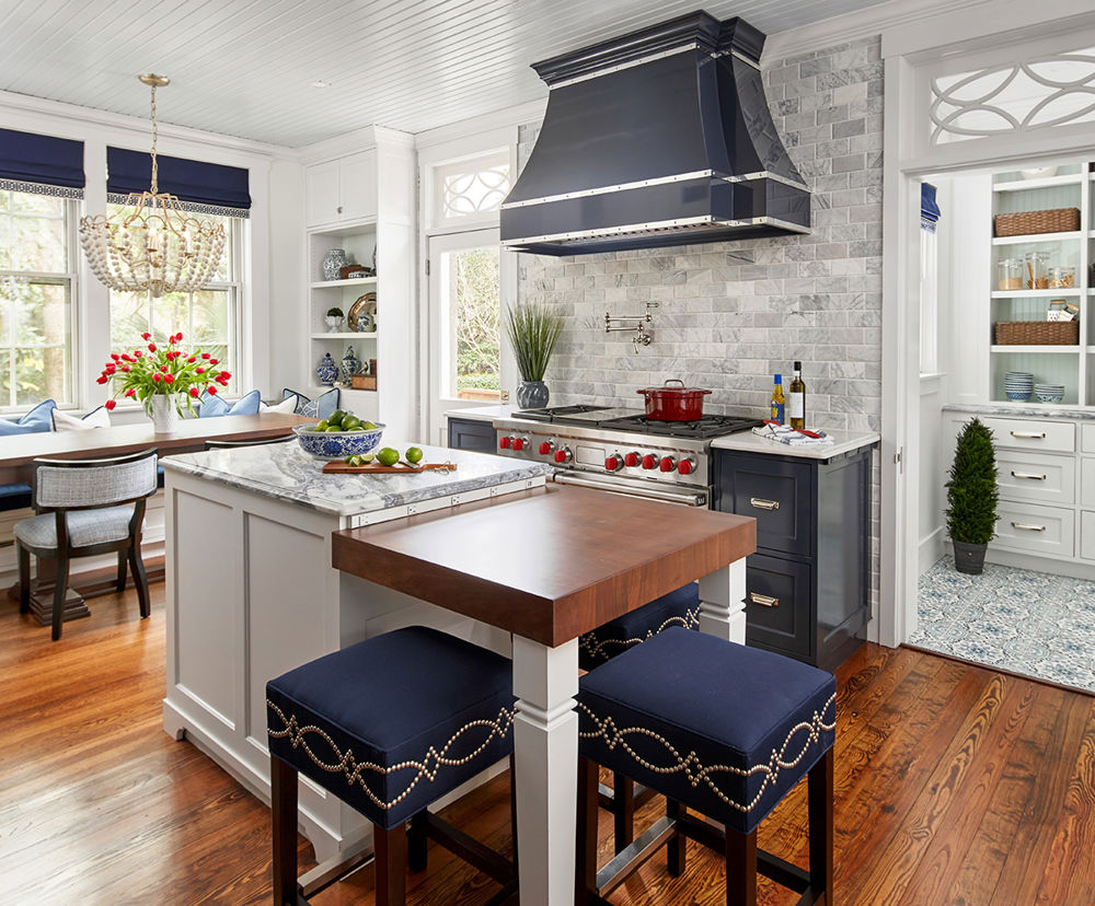 This 1902 historic kitchen's floor plan was split into separate kitchen and breakfast areas. The client wanted to reconfigure the floor plan to create one large kitchen space. To meet this challeging request, the myriad of pipes in the wall had to be rerouted; the hot water heater relocated; and two layers of solid brick had to be cut through to move windows and doors. The new kitchen feels like the historic kitchen that this stately home was always meant to have.