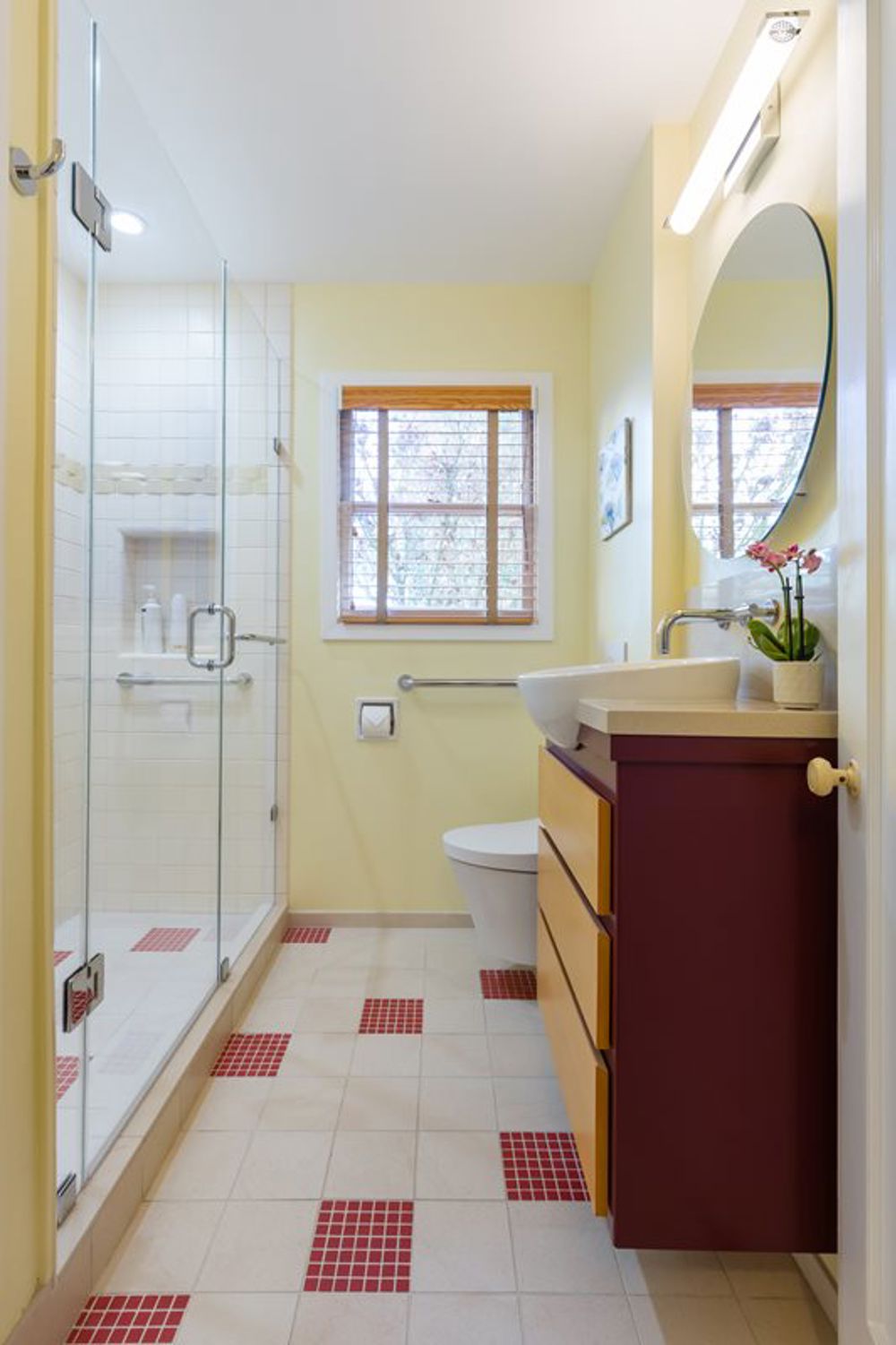 The original 1942 bathroom had deteriorated due to deferred maintenance, with only the window and toilet paper holder remaining intact. Inspired by Frank Lloyd Wright's Monona Terrace, the remodel faced obstacles and design limitations that prevented certain modifications. Despite challenges, materials were sourced to match the vision, including custom tiles, a round recessed medicine cabinet, a reduced-depth vanity, and a round semi-recessed sink. Universal design principles were incorporated to support aging-in-place features where possible. This remodel balances functionality, aesthetics, and accessibility, integrating Wright-inspired details while addressing the client's specific needs.