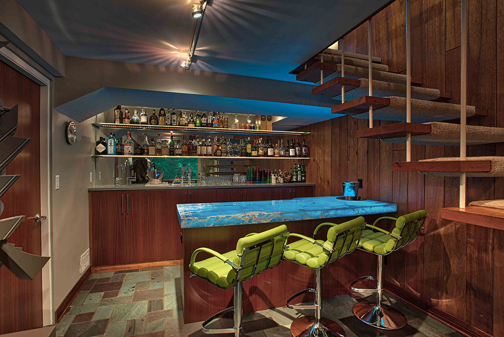 The clients' mission was to update a mismatched, poorly functioning bar area in this midcentury modern home to fit their entertaining needs. The existing space was removed of all existing carts, appliances and mirrored wall finishes. The window was covered over with a new mirrored wall and glass shelving. New cabinetry provides needed storage, and a shallow sink was plumbed in from the adjacent mechanical room. An offset undercounter fridge maintains floor space while not crowding the underside of the stairway. A back-lite onyx bar top and multicolored LED lighting at the glass shelving provides a fun nighttime atmosphere.