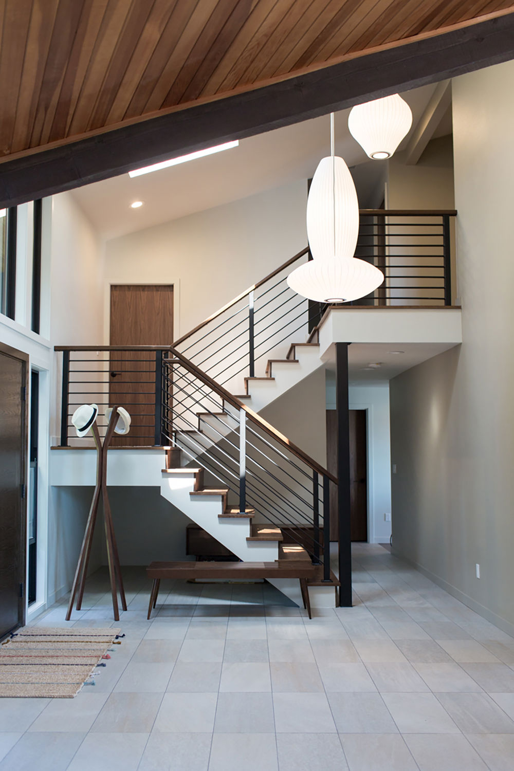 The client wanted to update the staircase, which was outdated and did not fit the style of the home. They also wanted to convert some of the unusable space into functional space. To accomplish this, a custom and modern floating staircase was created to open up the space below the staircase and create a bold statement in the entryway of the home. The landing area was also reduced to increase the size of the master bedroom. The staircase is made from solid oak treads and risers and includes a custom fabricated steel handrail.