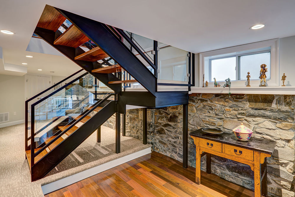 To have an architecturally interesting connection between the floors of their home where none existed was the goal of this project. The flow of traffic easily moves through the space and around the switchback set of stairs. The iron and glass railings provide safety and add a lightness to the area. The spacing of the glass panels is balanced, and the black iron is a striking complement to the wood stairs and exposed stone foundation on the lower level. The craftsmanship and attention to detail is outstanding, with clean welds and scribing materials to the stone foundation. This project is a success!