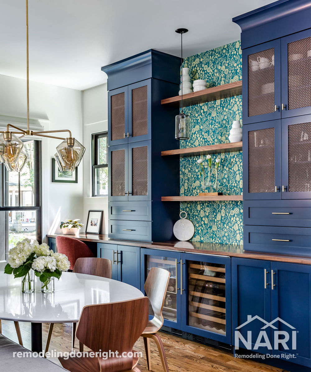 Where there was basic builder grade materials, there are now unique custom cabinets, wall coverings and beautifully stained walnut. A wall that had nothing going for it is now a showstopper. Bold colors and textures are featured throughout and yet the home is cozy and welcoming. With natural walnut, deep blue cabinetry, vibrant Scandinavian-inspired wallpaper and brass hardware accents, this wall demands attention. Both functional and fun, this is the dining room wow that the homeowner was looking for.
