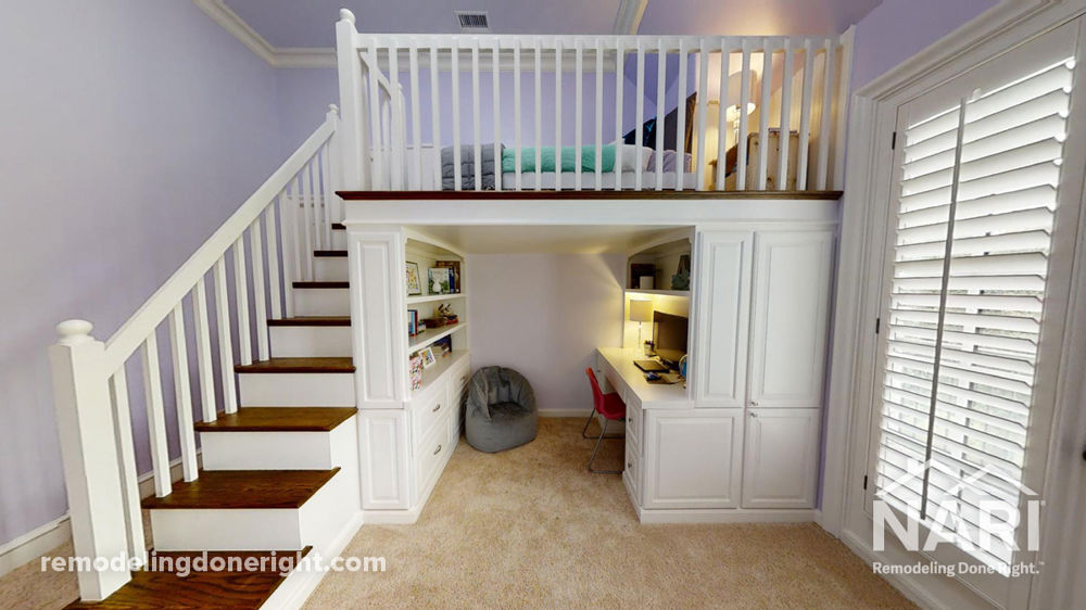 This custom-made wooden loft bed is every teen's dream! It has enough room to stand both under and on the loft. Underneath the bed on one side of the space there's a desk with drawers on either side and a hutch with one shelf above the monitor. The opposite side has three shelves for books, trinkets and treasures, as well as four large drawers for storage. Full length storage is also built into the sides of the bunk walls. A twin bed and nightstand fit comforably on the loft, making it perfectly cozy for sleeping or just hanging out, while the lower part has enough space for virtual home learning or working on homework.
