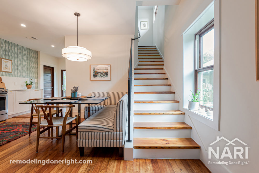 We needed to turn a staircase in order to open up the adjacent kitchen space and accommodate a new bathroom. There were many unexpected challenges in accomplishing this, including troubleshooting how to run these stairs through double concrete walls. Also, the stairs had to match the original long leaf pine flooring in this home. An old government building that was being torn down had old longleaf pine posts, which were salvaged and reused on the stair treads. A custom iron railing complements this beautiful statement staircase.