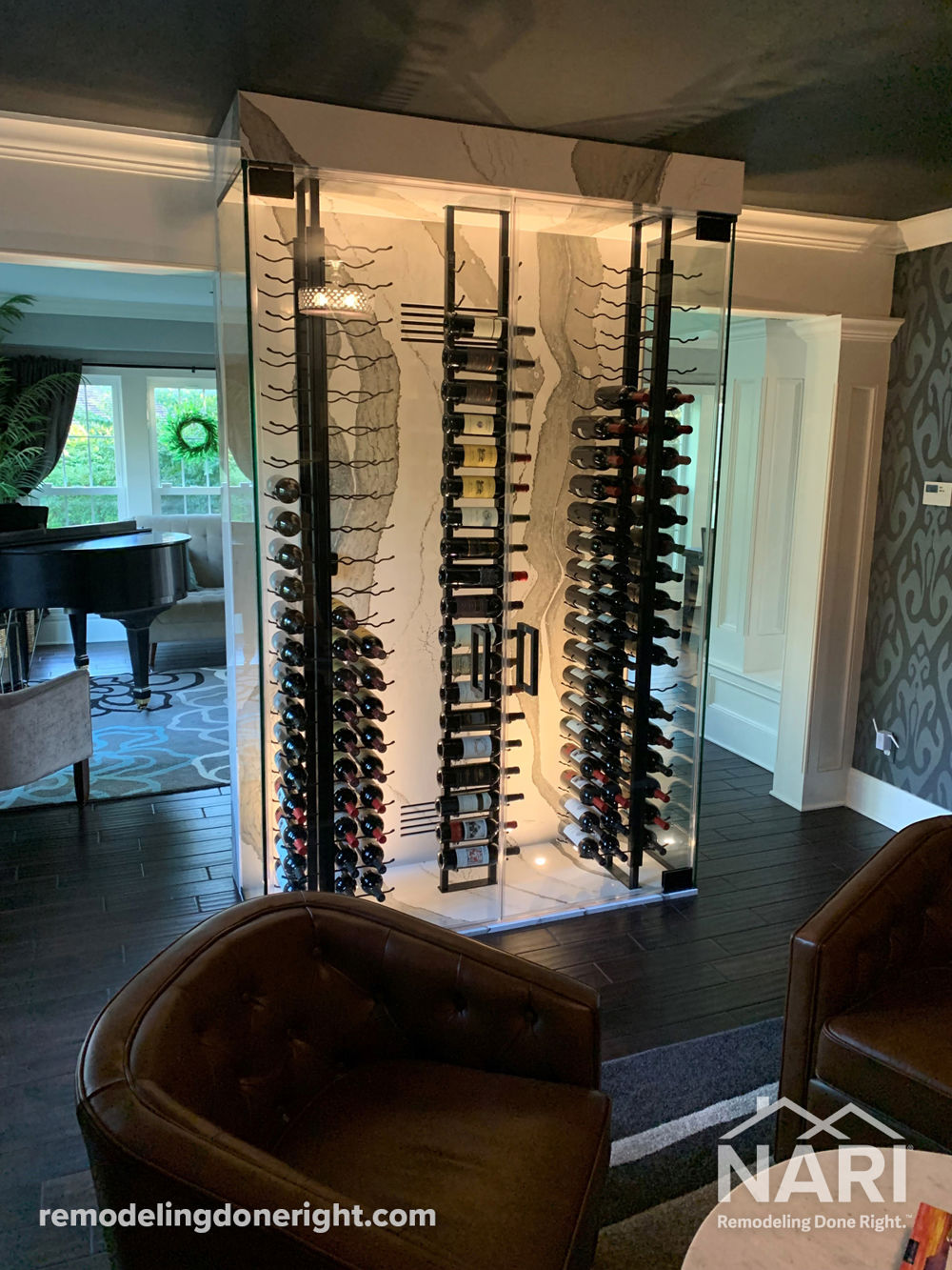 These homeowners desired a wine enclosure that would add drama to an underused living room. A stone enclosure with space for over 150 bottles of wine cooled to the correct temperature was designed. With the use of thin quartz, the soffit, walls and base were wrapped in a striking patterned stone. Adding up-lights integrated into the slab allows for varied lighting throughout the day and evening. Water jetted vent slots were also added to the stone for proper ventilation.