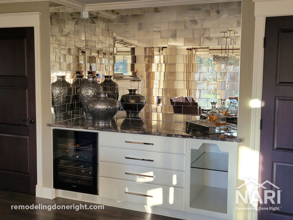 The customer wanted to make use of the empty space in the formal dining room. Custom mirrored glass tile and Cambria top off the custom cabinets. The cabinets were chosen to match the existing style and color of the room and the glass/mirror tile was added to create a unique look to the space. The new white cabinets include glass shelves and a built-in wine fridge with a custom toe-kick vent cover that gives the wine fridge a built-in appearance. The homeowner loves the way the mirror tiles make the room seem larger.