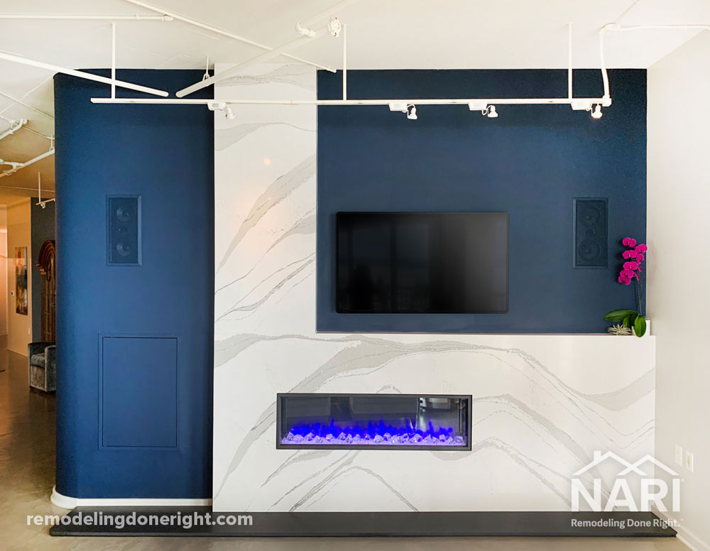 Like many others, these clients were spending more time at home so they wanted to create a space that fit in with the rest of the home and was more in line with their modern aesthetic. An existing wall that had a double-sided fireplace for both the master bedroom and living room was remodeled. This fireplace transformation took the space from dark and dated to crisp, clean and modern. With a massive piece of Cambria quartz as the focal point, hidden doors, and a new fireplace, this fireplace element truly was a game changer for these homeowners.
