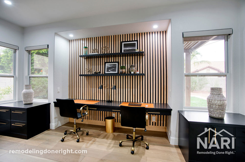 This homeowner's old office went from dark and out-of-date to bright and functional. Enclosing an adjoining room created a separate television viewing space and an office. New cabinets provided better storage along with a dual built-in desk work zone. New lighting and a ceiling fan updated the area. The black-painted design feature wall with wood slats and black floating shelves along with new furniture delivered a modern finish.