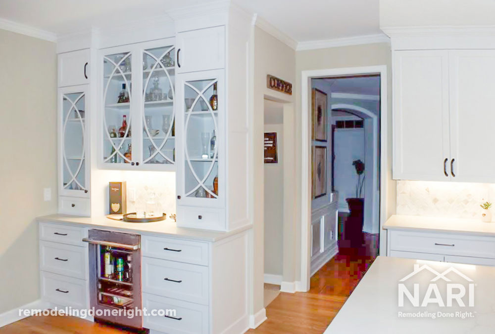 As someone who loves to cook and host, this homeowner's kitchen needed to be updated to create more space for enjoying everyday meals and hosting guests. The custom wine bar and coffee alcove nestled in the new beverage center are adjacent to the kitchen as not to disrupt foot traffic, but are still visibly accessible as part of the kitchen. The expanded floor plan also opens access to the dining and living rooms, establishing the kitchen as the true heart of the home.