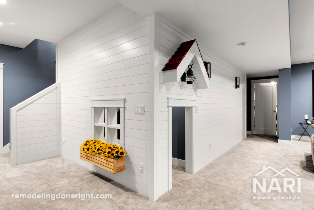Without having a typical playroom for toys and games, this couple wanted to establish a dedicated space for their children to play. By transitioning the basement stairs into a playhouse, the previously underused area now is a hub for children's activities. Complete with a front light, additional outlets, and an open window into the basement living areas, this nook is a fun solution for encouraging organized play.