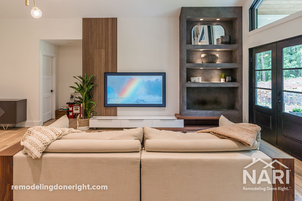 This upstairs living room project transformed a blank, uninspiring space into a welcoming family hub. Striking the balance between form and function, a bioethanol fireplace was installed, providing the appeal of real flame without the need for a flue. Custom stucco surround, downlight-enhanced shelving, and a low-profile white entertainment console anchor the room, while walnut wood panels lend visual asymmetry. Each element not only addresses specific challenges, such as spatial limitations and safety considerations, but also enhances the room's modern aesthetic. The result is a multifunctional, inviting environment that elevates the home's overall experience.