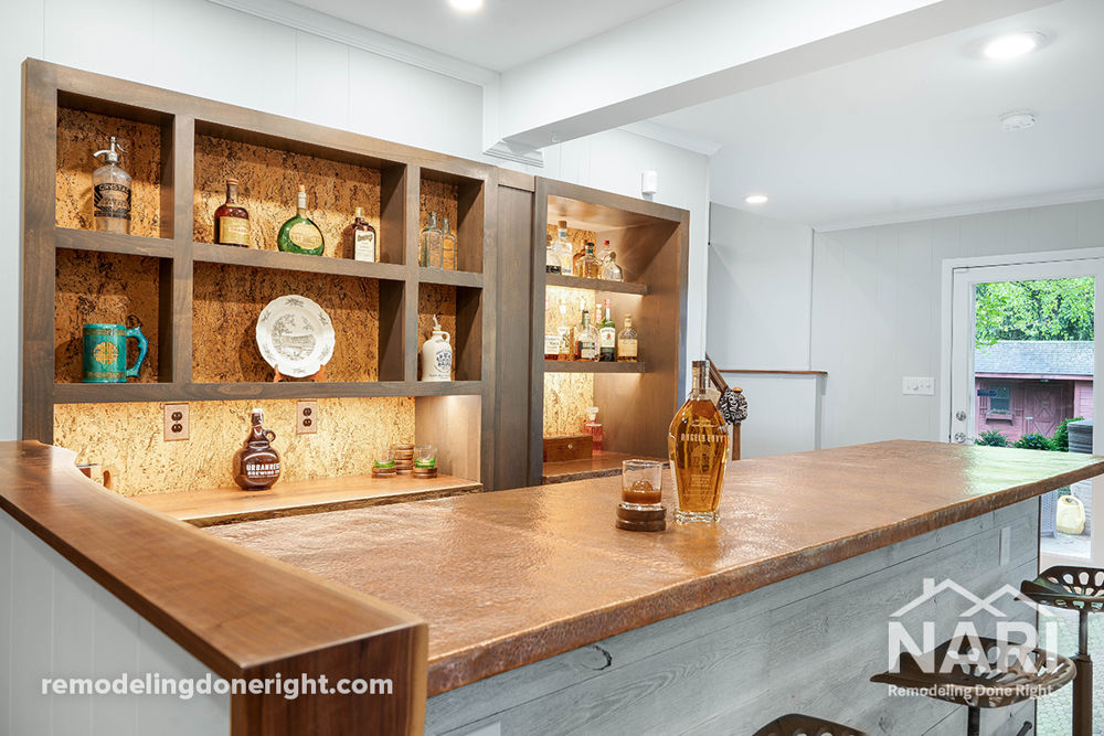 This basement bar went from dated to an industrial pub style that blends with the existing rec room. The redesign includes custom cabinetry with personalized storage, a natural cork backsplash, a live-edge wood back counter, and a ship-lapped front counter wall. The showstopper feature is the collaborative effort on the custom hand-hammered copper countertop! The eye-catching result now fits into the homeowner's lifestyle while showing off their bar memorabilia.
