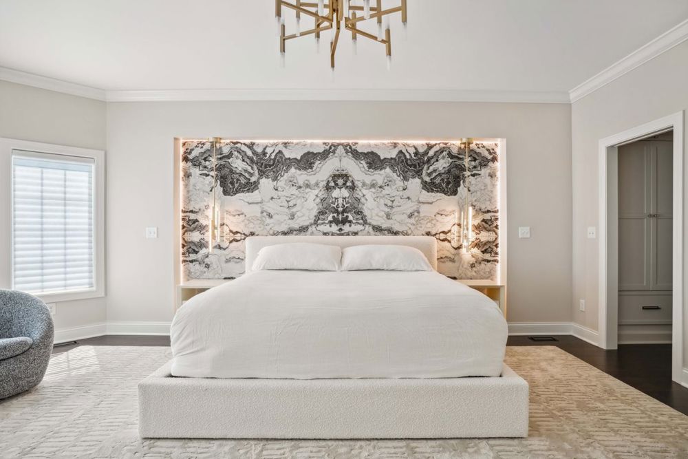 The client's main goal was to create a more substantial master suite. Once the space was expanded with a 3-story addition, focus shifted to the wow. The design delivered the desired wow factor with a modern aesthetic and unique use of materials, textures, and lighting. A stunning alcove featuring custom book-matched faux marble panels, flanked by modern gold pendants and sleek LED cove lighting, accomplishes this.