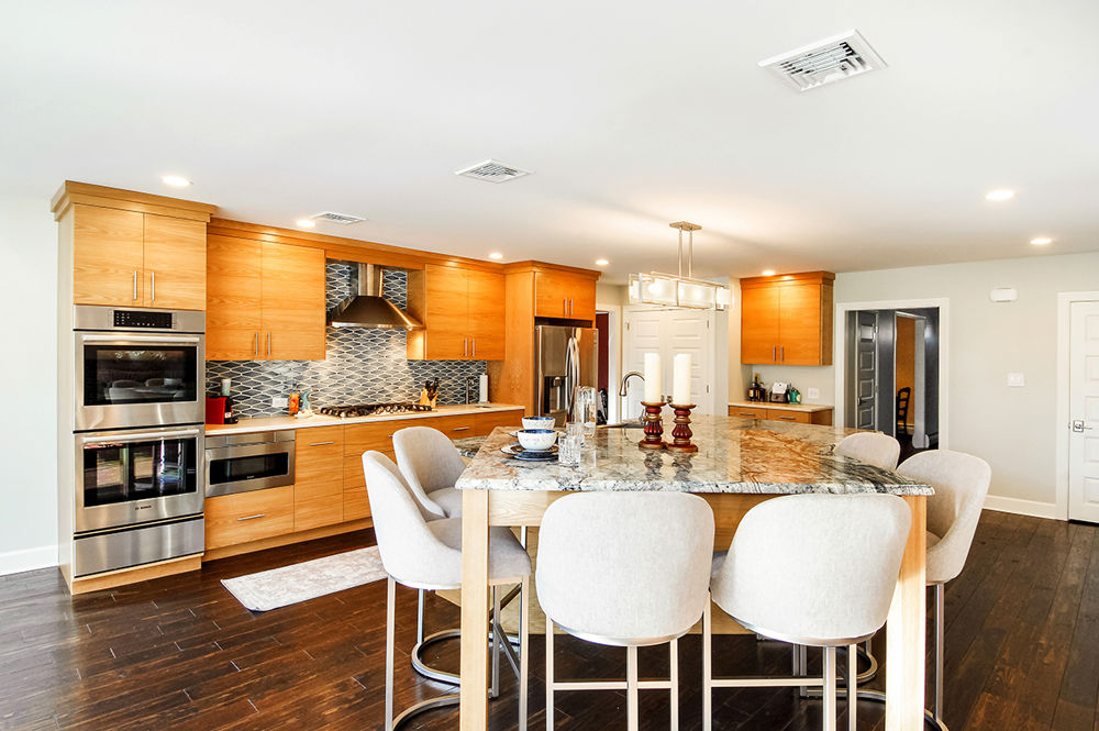 The clients live in a quaint suburban neighborhood with traditional aesthetics. They had an outdated kitchen with inadequate storage and an inconvenient workflow, and a drafty sunroom. They desired a more open floor plan with better flow in the kitchen, multiple seating areas, and no cooktop in the island. Insulating the sunroom was a priority as well. To improve the workflow and layout, the laundry was relocated, a two-tier island installed, and a better cooking triangle created for entertaining. This contemporarry kitchen is now a space with a more modern style floor plan for entertaining 20-to-30 guests regularly.