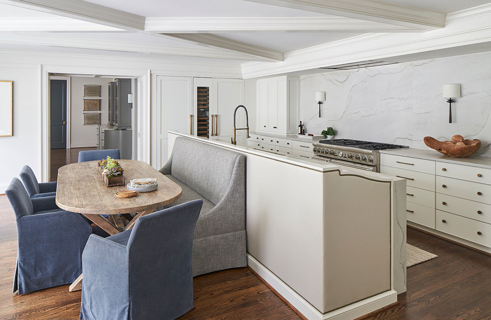 The homeowners wanted to utilitze the existing square footage to better suit their lifestyle. Upon entry the homeowners wanted to capture the grandeur of what was to follow in the rest of the home. Leading through the home a powder bath was added that mirrored finishes in the new scullery off of the kitchen. Through to the kitchen an upholstered nailhead trim island with waterfall marble edge is flanked by the new breakfast area. The rear and side walls of the family room received new enlarged windows, doors and millwork along with a domed plaster ceiling to visually expand the space.