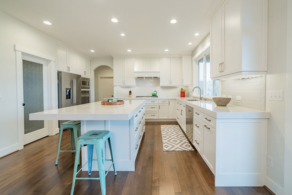 This kitchen and living area was originally designed with dark colors, which made the area feel very small. The homeowners wanted a bright and open area that is inviting and conducive to entertaining. By re-designing these spaces using lighter colors and materials, the kitchen was transfomrerd into a much brighter and inviting space with new appliances and surfaces, a larger island and custom range hood. The adjacent living space was updated with a seamless quartz surround and custom bookcases to make the entire space feel cohesive.