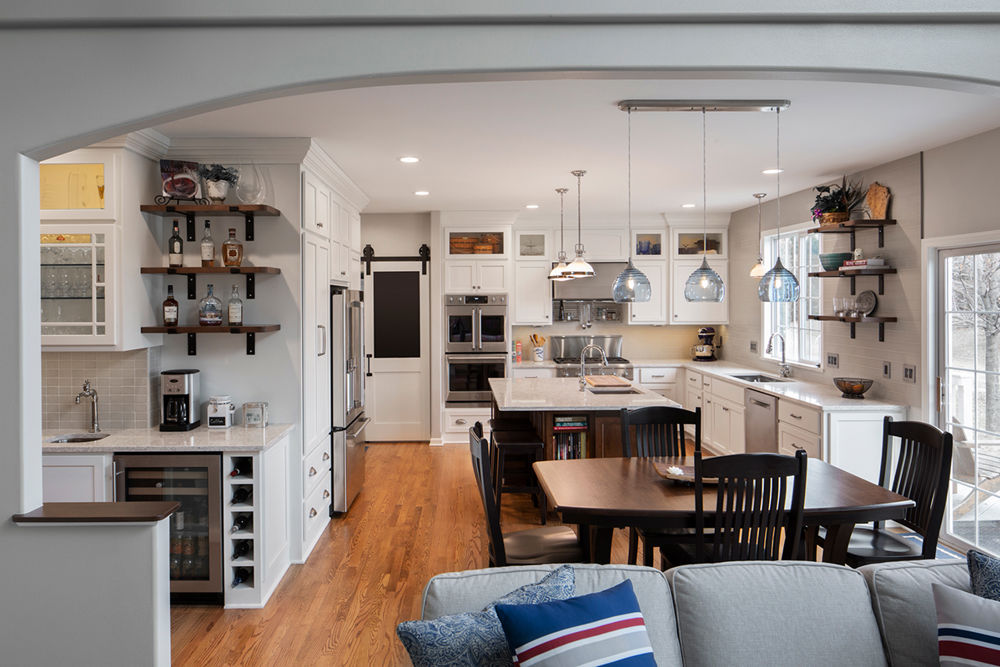 An aspiring home chef, this client was ready for professional-grade appliances but needed help reimagining the space to meet this goal. The space had poor flow and work areas but offered generous storage and closet space. To accommodate the larger appliances, improve flow and not lose storage, an interior wall was removed to open the kitchen area. Now it is a relaxing environment that fits their lifestyle. Their new kitchen includes three sinks, a wet bar, ample working space, and custom storage. Entertaining guests while the master chef prepares gourmet meals is no longer a challenge in the improved, spacious layout.