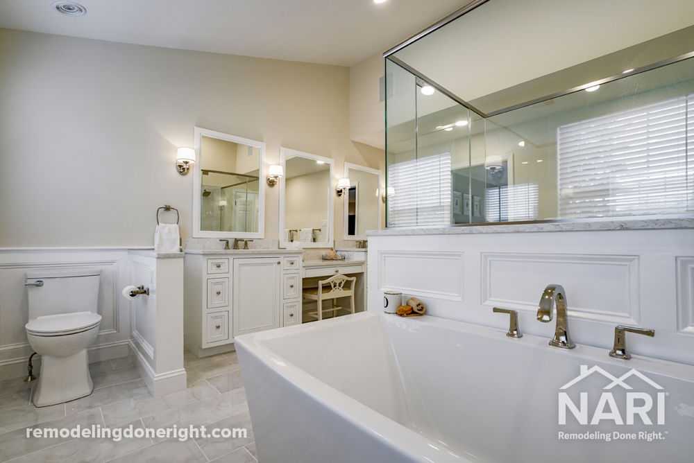 The homeowners sold their business and moved closer to family. They wanted their new house to accommodate visting friends, so they needed to keep four existing bedrooms. They also desired a bigger master bathroom, new guest bathroom, updated master bedroom, and a new walk-in closet. Unique design solutions include using the dead space in the second story foyer to create a guest bathroom, and creating a walk-in closet out from a fifth bedroom.