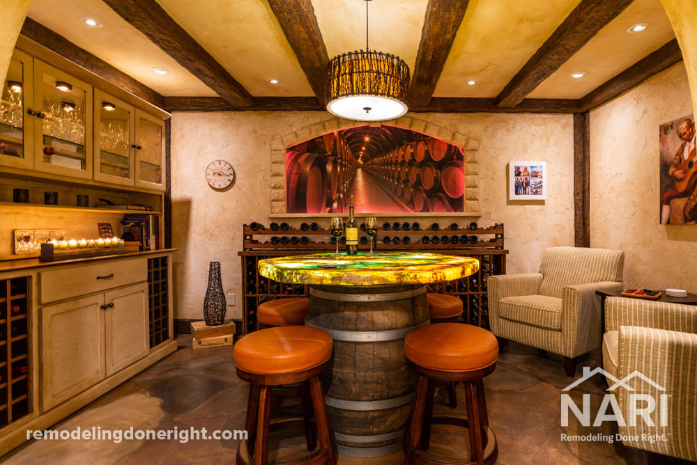 The homeowner needed a home for his 1000-bottle wine collection and asked to locate it in an unfinished area of his basement. He requested two chillers-one for reds and one for whites-bar-height seating for four, lounge seating for two, wine racking that holds several hundred bottles and a special place to celebrate all things wine. This Old-World hideaway has an arched door entry, hand-troweled limestone walls and ceilings, rustic beams and trim, a table with a French oak wine barrel base, and a custom faux onyx top that seats four.