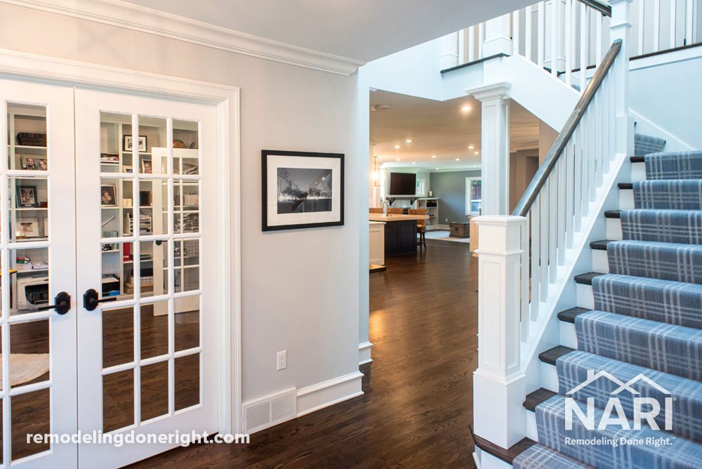 These homeowners purchased this newly remodeled home knowing they wanted to transform it from contemporary to classic traditional. Several load-bearing walls were removed to de-compartmentalize the first floor and create a welcoming sightline from the foyer to the back of the home. Traditional style features include French doors, panel-faced appliances, crown molding, stately columns and custom railings. Tile flooring was replaced with oak hardwood to provide continuity throughout the entire first floor. A large skylight was installed over the central staircase for natural light and an extended kitchen island provides needed storage and counterspace to prep food and entertain.