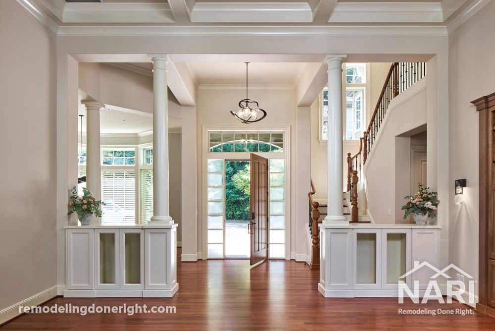 An inspection of the clients' recently purchased 15-year-old home revealed that the space not only needed updating, but that poor craftsmanship had deteriorated some of the features beyond repair. A delicate balance was needed to peel back and repair layers of existing architecture in this whole house remodel while accomplishing the homeowners' wish to transform their traditional house into a space with a more relaxed farmhouse feel.