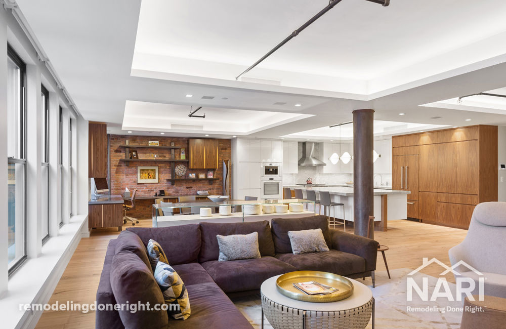 The clients lived in their apartment for some time to get a feel for the space before they ultimately decided on what they needed for their home. This year-long renovation started with a full gut of the apartment. The new floor plan includes three bedrooms, two-and-a-half bathrooms, a laundry room and an office. Reclaimed oak floors, new electrical, new plumbing, a new HVAC system, a new sprinkler system, and new audio visual were installed throughout. Two-tone custom kitchen cabinets in high-gloss white lacquer and walnut are a highlight of the kitchen.