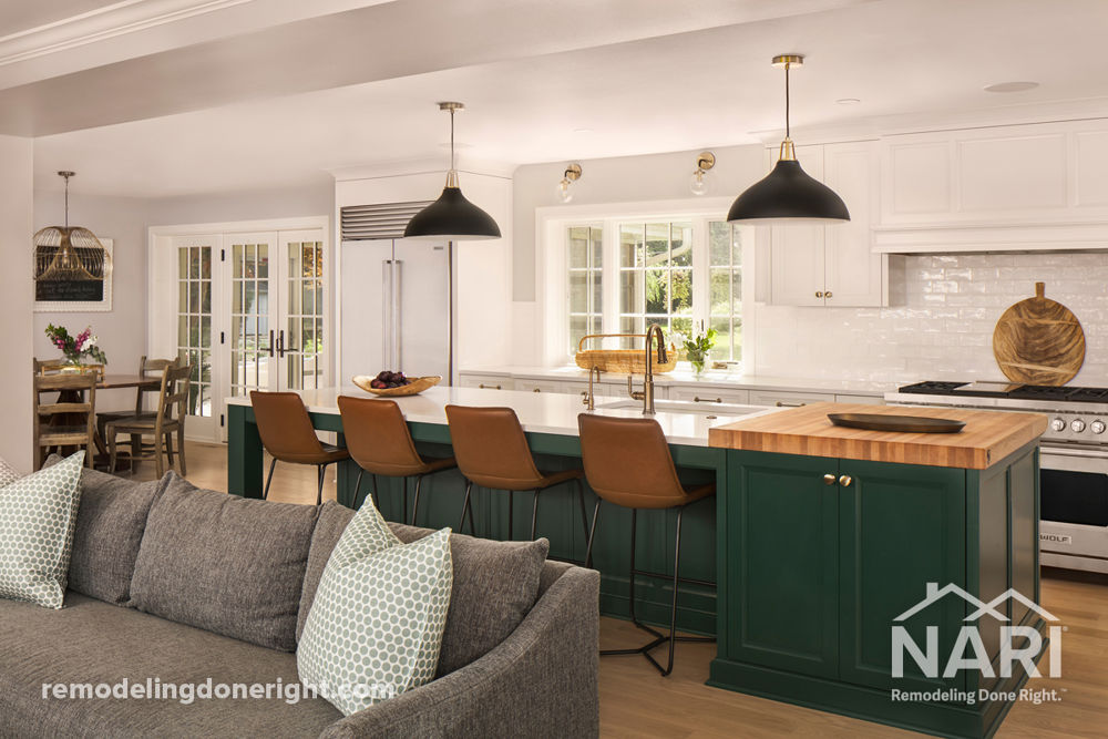 The first floor wasn't conducive to the family of five's lifestyle and entertaining. Dated and compartmentalized, they desired more connection between spaces, and a home that reflects their style. With the removal of walls, the kitchen expanded into the formal dining room and is now open to other entertaining spaces. The kitchen is timeless, modern and charming with white furniture-style cabinetry, a jewel-toned island, a custom butcher block, and black and brass hardware and fixtures. The remodel also updated the three-season room and created a more functional entry and laundry room.