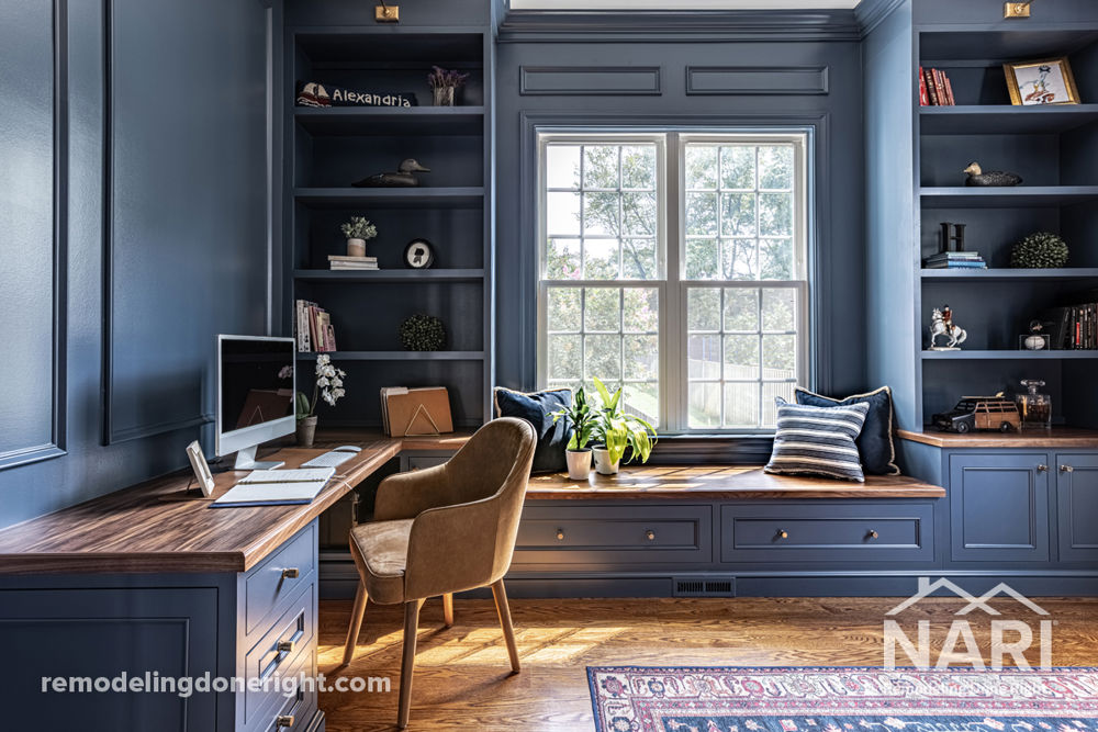 This plain office was converted into a sophisticated space with added storage, custom finishes, French doors, and separate work stations for the husband and wife. The office reflects the style of the homeowner who owns her own styling businesses. Features include custom cabinetry and shelving, a custom open cabinet with floor mounted roll out for a printer, crown molding, and wood countertops stained to match hardwood floors. The new space now has the drama, storage and additional light the clients desired.