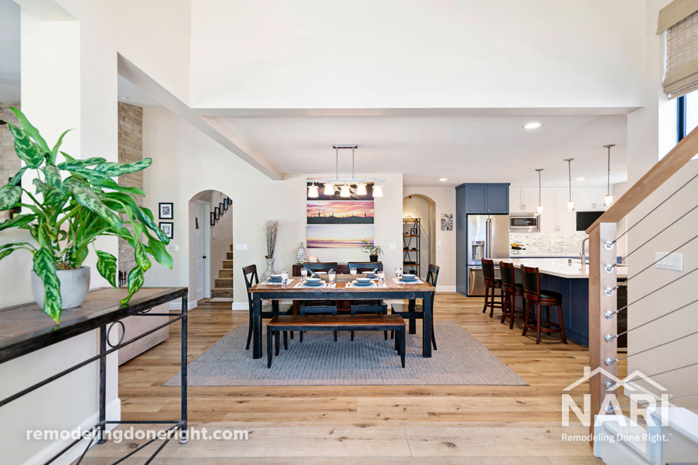 The original layout of this first floor interior had wasted space and needed to be reconfigured. The office/loft area was the main unused area (perfect for storage), so we moved over the entry door and converted it into a large foyer with steps down to the main living area. Moving the dining room to the center during the remodel extended the kitchen's footprint and created a large open concept. In addition, the existing family room was unused, so it was converted into a bedroom and full bathroom for guests.