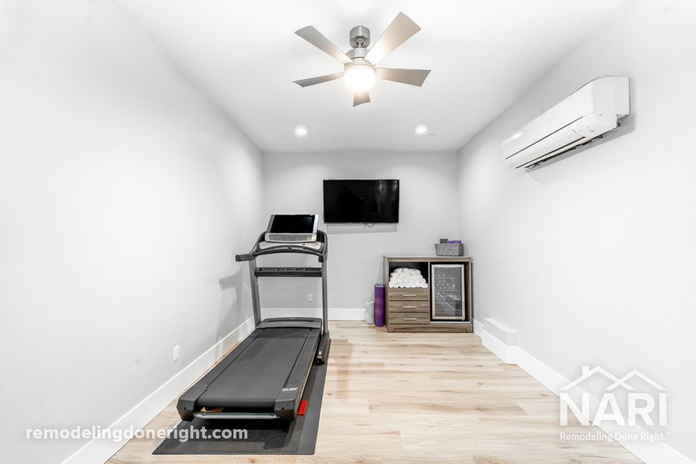 A one-of-a-kind home office and workout space was designed with this remodel by transforming an unutilized lengthy garage bay. Like many others during the COVID-19 pandemic, these clients found themselves working from home and in need of functional new spaces that would allow them to work and stay active. The rest of the home is very modern in style, so it was important to harmonize the new design with the rest of this beautiful home. The space features durable LVP flooring and matching eyebrow windows.