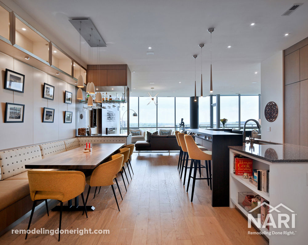 A stunning remake of this downtown Columbus, Ohio, high-rise condominium was accomplished by removing every inch of the 2500-square-foot interior, peeling back to the concrete floor, metal framing and glass walls. Filled with custom-crafted features, including custom Oak cabinets and built-ins, a Murphy bed-equipped guest room, and a luxurious wet room bath and shower with heated tile floor, this home is a testament to some of the finest artisanal craftsmanship. Now the interior finishes outshine the spectacular city view.