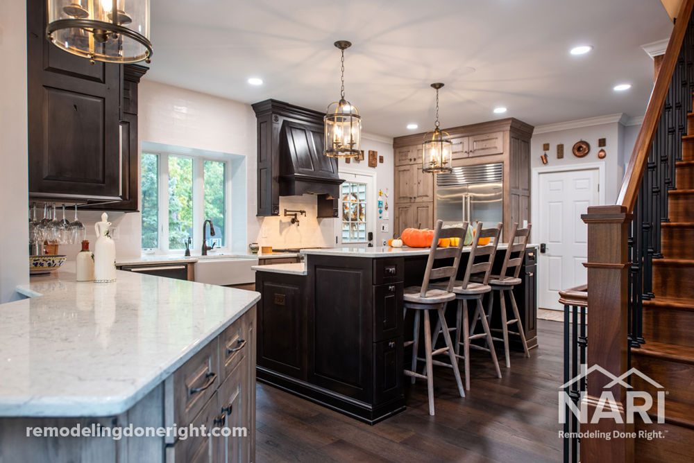 This homeowner wanted to open up their space as much as possible for easy access and visibility into every room. Stairwells were revamped with rustic inspiration to compliment the design of the kitchen. The first-floor walls were removed in the hallway to transform a small family room into a great room that fits all of their favorite people.