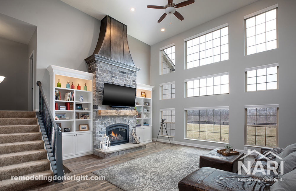 Wanting to open up their great room in order to enjoy their wooded backyard view, these homeowners replaced their inefficient fireplace with a beautiful statement fireplace that catches the eye and doesn't block the view of their backyard.