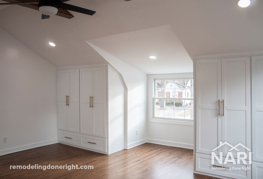 This family needed to add a fourth bedroom to accommodate their work-from-home schedules and find space to spread out their growing boys. The unfinished attic provided the perfect space for this new room, which was designed around a gambrel-style ceiling in order to incorporate the wardrobe and windows with a symmetrical bedroom finish.