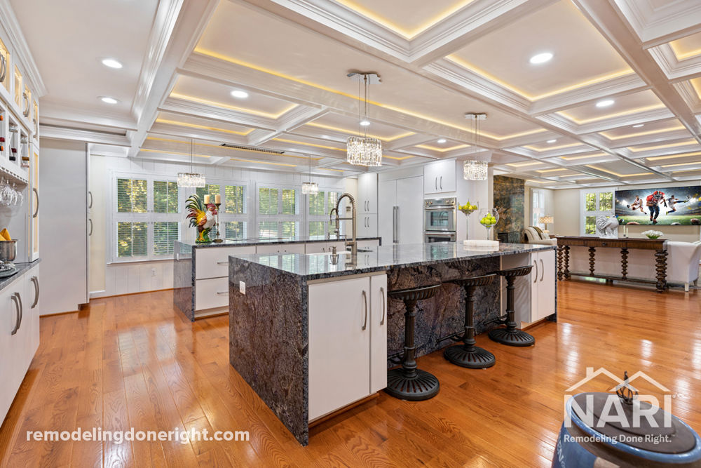 This 1975 colonial home underwent a complete transformation to accommodate the changing needs of this busy family of five. These additions, which included inserting steel beams and relocating plumbing, changed the layout from compartmentalized to an all-open floor plan. Complete with new floors, new windows, and entirely new color schemes, the new interior makes this home feel brand new.