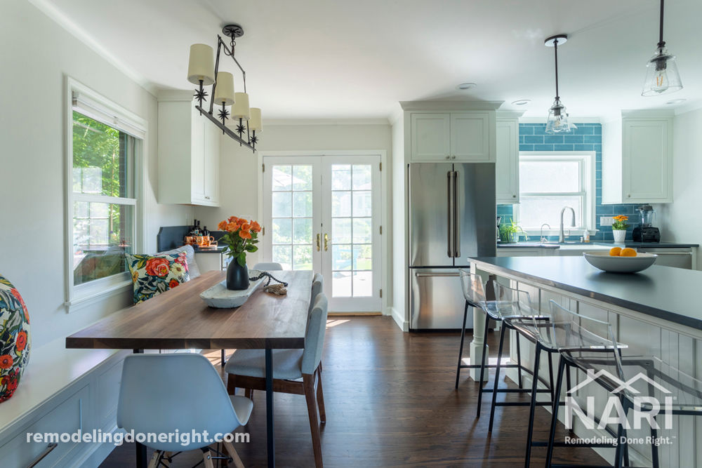 With accessibility top-of-mind, a full bathroom and new mudroom were installed after removing a central powder room. By removing the separating wall between the dining room and kitchen, an open concept layout was implemented, creating the perfect space for entertaining. Complete with a larger kitchen counter, blue ceramic backsplash, and colorful pantry, this home is one guests can't wait to be invited over.