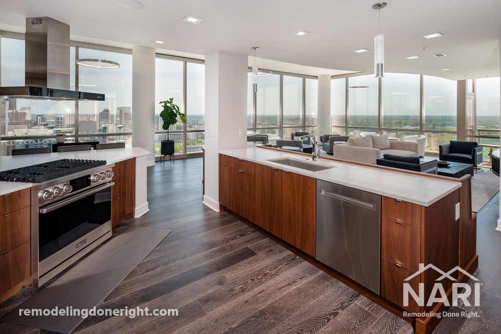 This homeowner wanted to modernize their penthouse condo and take advantage of the sweeping views of the city. By removing walls, a brand-new kitchen and dining area was created, complete with a custom glass wine refrigerator, that opens into an updated living room. The primary bedroom and bathroom were transformed, along with two guest bedrooms and a second bathroom for a sleek, maintenance-free home.
