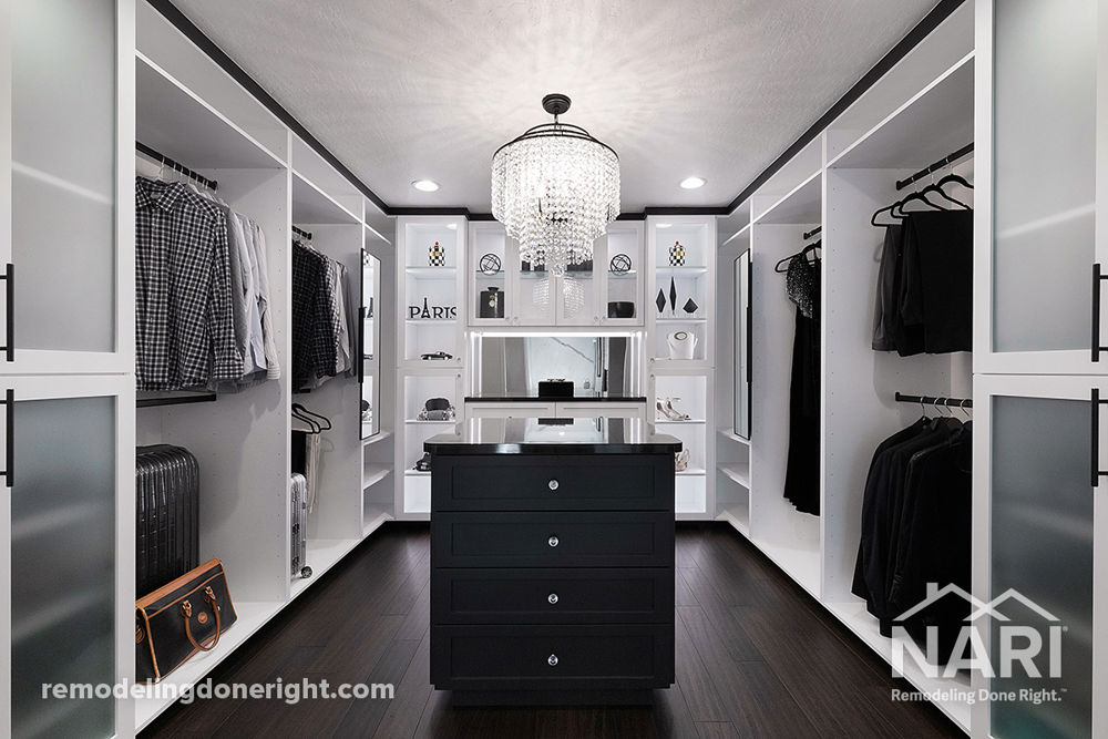As the saying goes, happy home, happy life. A new master closet made these homeowners very happy and no longer caused them stress. An attainable and maintainable space that would give them ease of starting each morning with a smile. The disorganized space was transformed into a fortress of functionality, efficiency and style. The mind-blowing finished result would be a high contrast of neutral materials along with a strong display feature wall design, floating island and majestic chandelier. It's now a pleasing showstopper!