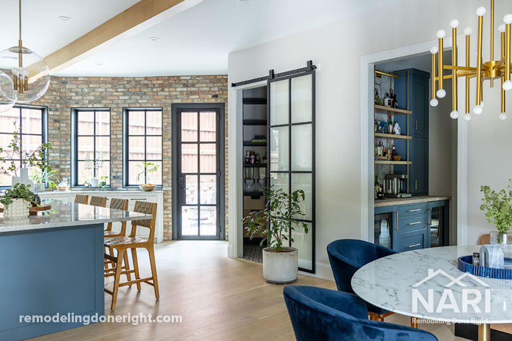 This '90s home underwent a comprehensive remodeling process that transformed it into a modern, open, and luxurious living space. It is the feeling of getting a brand-new home without having to tear it down or move. The removal of walls, rearrangement of doors and windows, and the use of cohesive design elements contributed to creating a light, airy, and visually stunning home. The goal was to update the home and make it more functional for the homeowner. Creating optimal workflow and an organized pantry in the kitchen was a priority. The home also has a new moody dining space.