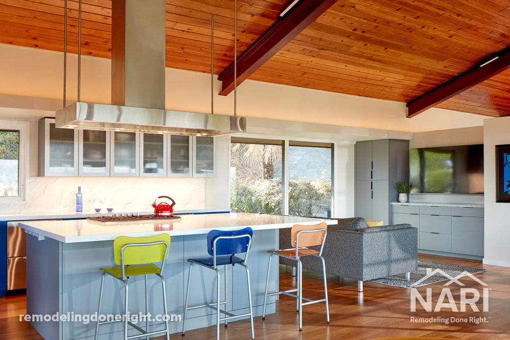 A breathtaking view is the centerpiece of this interior remodel. Removing an obstructed wall seamlessly merged the four living areas, creating an open great room. The homeowner's love for the color blue is infused throughout and a custom partition crafted from remnant materials showcases their beloved art collection. The versatile kitchen now serves as a hub for culinary delights and crafting drinks, making this home a year-round entertainment space.