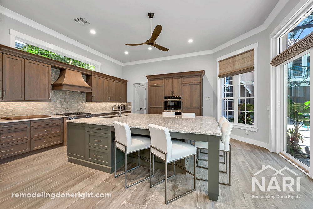 The owners this property now enjoy a serene oasis, uniting the cabana, outdoor kitchen, and pool. The final stage witnessed the complete reinvention of their primary residence's interior. The primary focus centered on crafting an adaptable living environment, prioritizing aging in place and enhanced mobility. Functionality improvement and optimized space utilization were key objectives. Previously, a segmented floor plan hindered seamless entertaining, prompting the mission to create a cohesive and accessible sanctuary