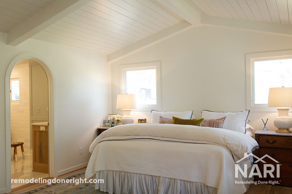 This client sought a brighter, more architecturally detailed space. The adjacent office, seldom used, was repurposed into a primary closet with a new doorway. Vaulting the ceilings, adding an arched entrance to the bathroom, and balancing the room with two new windows elevated the project. Hardwood floors and white walls enhance the bright, airy, ambiance. The result is a revitalized primary suite and closet, seamlessly blending architectural finesse with luminosity, fulfilling the client's desire for a harmonious and aesthetically pleasing space.